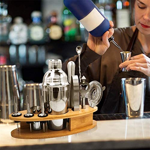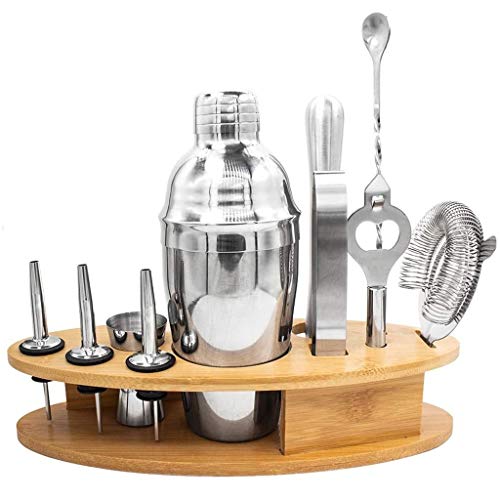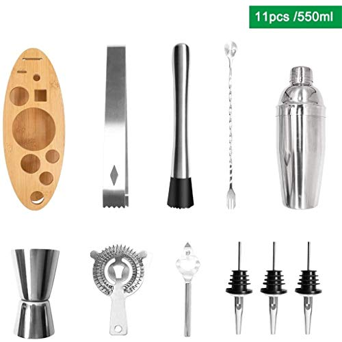 11 Stücke Bar-Set deckt sämtliche Ihre Bedürfnisse ab: 750ml Shaker, Sieb, Eiszange, Jigger, Korkenzieher, Pistill, Ausgießer * 3, Barlöffel, Holzrahmen.
