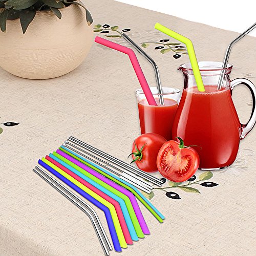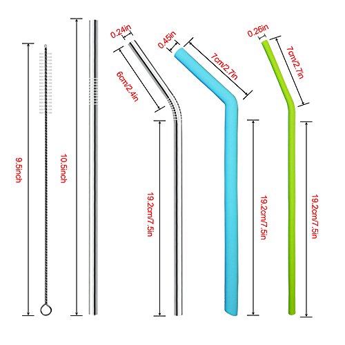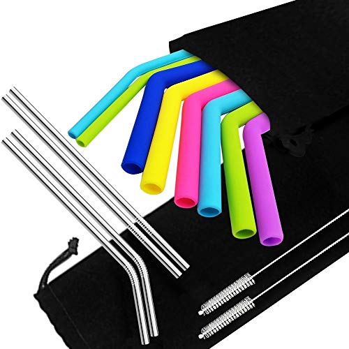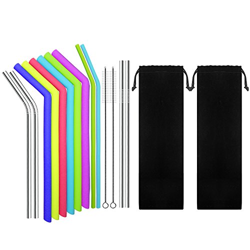 12 Stufe: Enthält 8 helle, wiederverwendbare Silikon-Trinkhalme in 6 verschiedenen Farben weiterhin 4 Edelstahl-Trinkhalme, 2 Aufbewahrungstaschen, 2 Reinigungsbürsten.