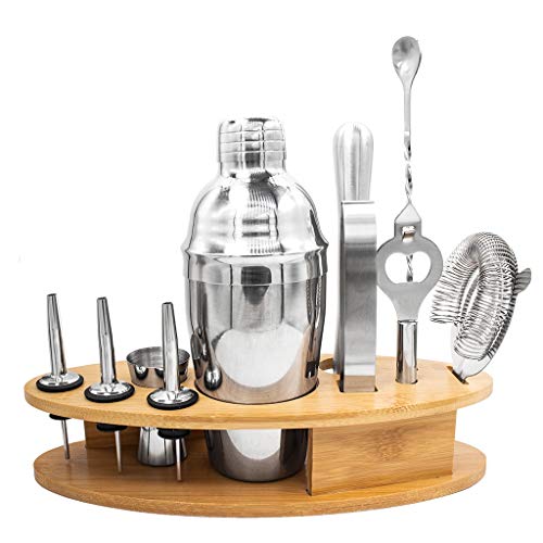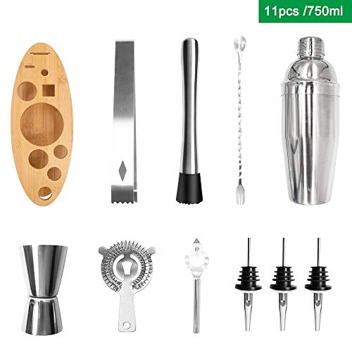 11 Stückchen Bar-Set deckt aus Ihre Bedürfnisse ab: 750ml / 550ml / 350ml Shaker, Sieb, Ice Tong, Jigger, Korkenzieher, Pistill, Ausgießer * 3, Barlöffel, Holzrahmen.