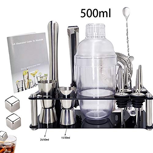 1 x 500 ml Shaker, 1 x Muddler, 1 x Sieb, 1 x Eiszangen, 1 x Löffel, 4 x Ausgießer, 1 x 15 / 30ml doppelseitiger Jigger, 1 x 25 / 50ml doppelseitig Jigger, 2 x Edelstahl Eiswürfel, 1 x Kanalmesser, 1 x Getränkerezept, 1 x stilvoller Ständer.
